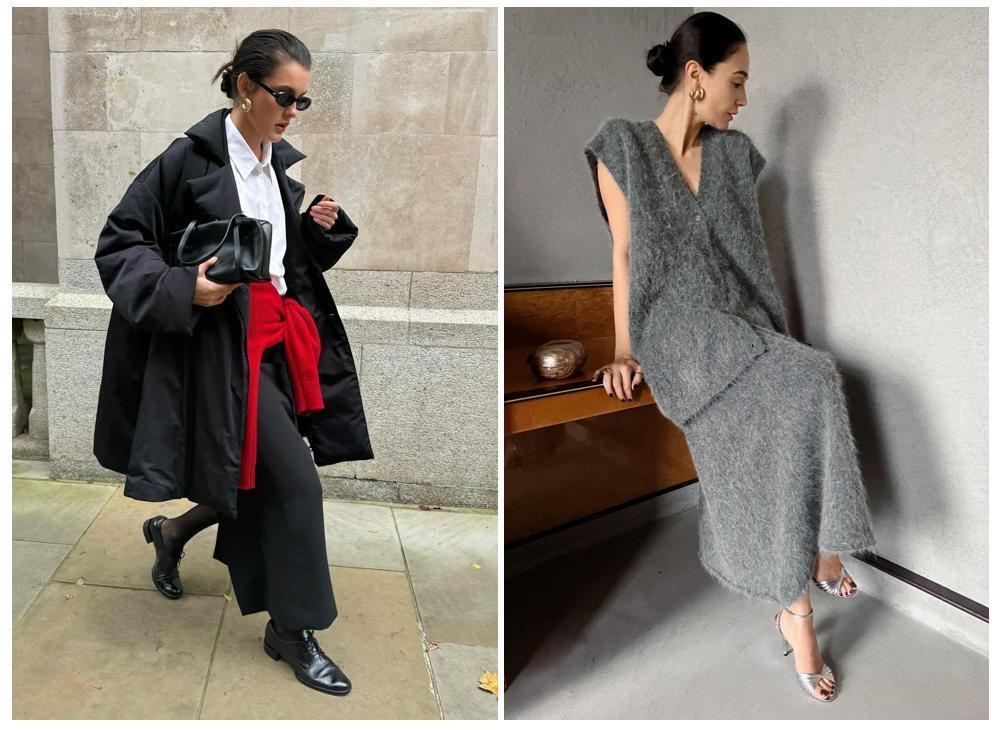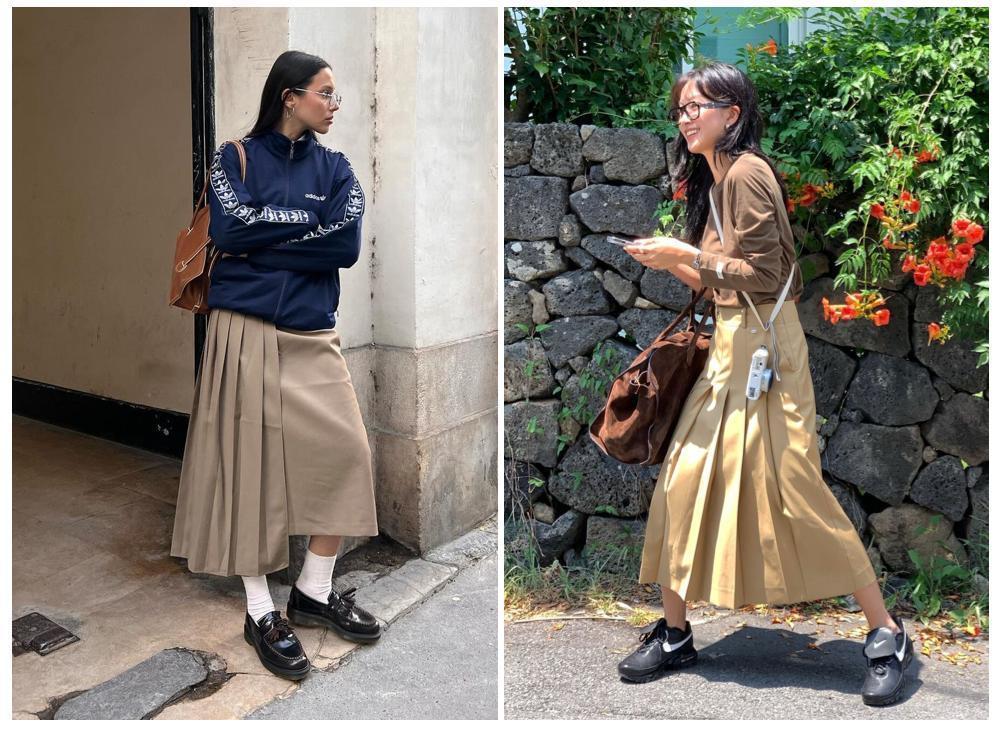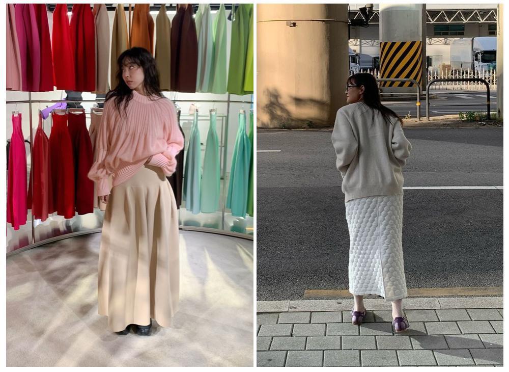 压褶直筒裙的典雅风格则十分明显,看似如建筑般的明暗褶皱非常有艺术感,即使上半身只是搭配了一件基础款针织衫,造型看起来也不会普通无聊。