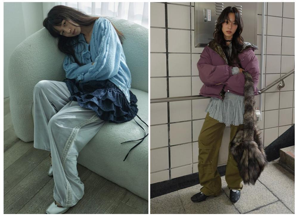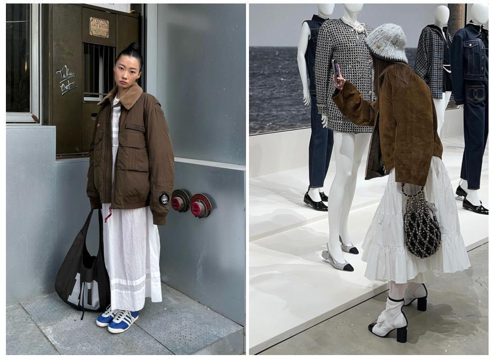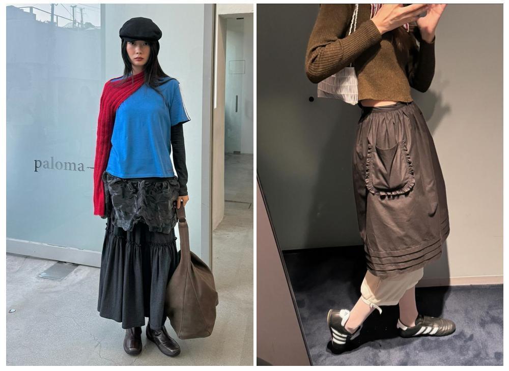 而运动裤与半裙的搭配,则显现出一点俏皮的风格,就像上学时叛逆的女学生,用运动感打破淑女的定义,看起来满满的元气,造型感也变得很强。