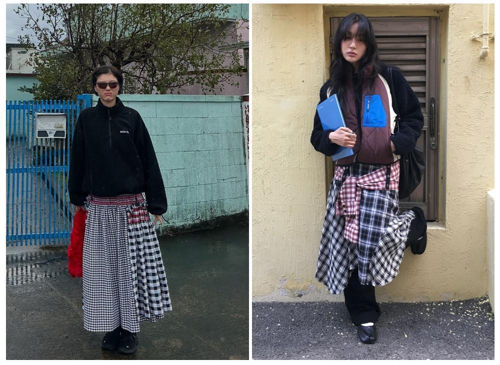 格纹元素的回潮也使格纹半裙再次被玩出了新花样,不同颜色方格的重复叠加,以及小格纹与大格纹的视觉差搭配,都很出彩时髦。